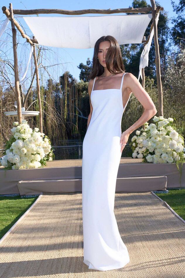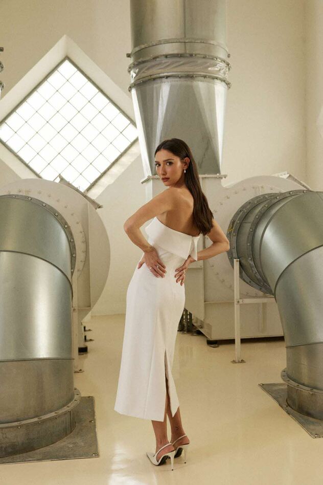 מאוחר יותר המשיכה הכלה לשמלה השלישית – שמלת המסיבה. מדובר בדגם עשוי משי בגימור חצי מבריק, עם מחשוף עמוק שמתכנס לאלמנט כיווצי בד באזור המותן.