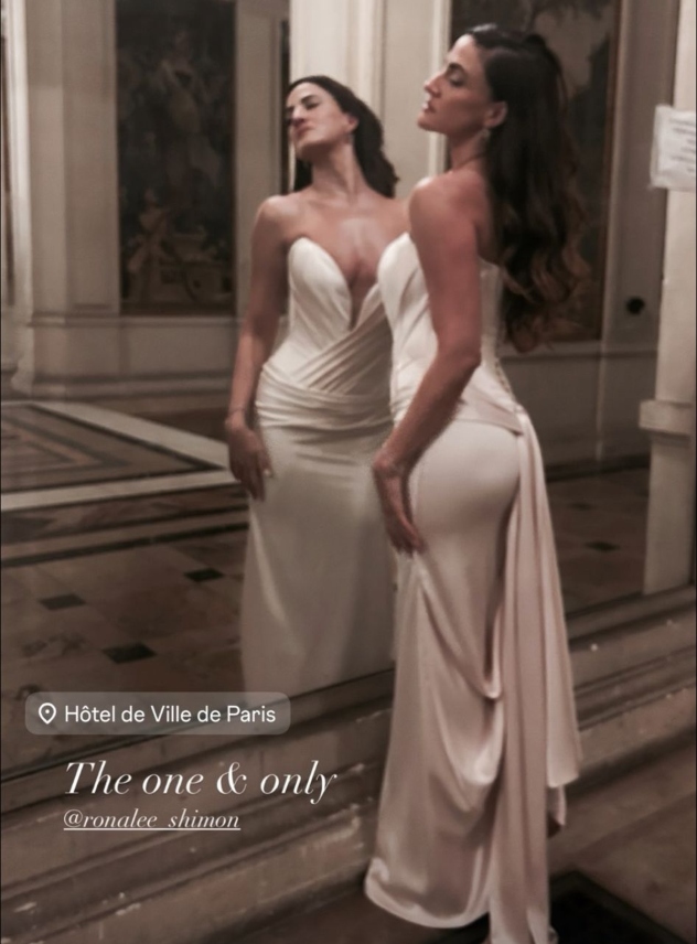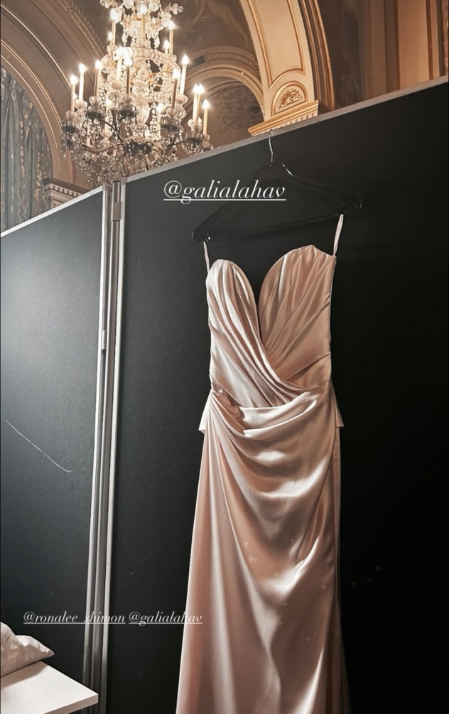 הדובדבן שבמרנג היה לוק הערב הסקסי: שמלת סטרפלס מקולקציית הקוטור של גליה להב לשנת 2025. מדובר בשמלה עם קאפים מחודדים ומחשוף קדמי עמוק, המעוצבת עם נגיעות רומנטיות של קיפולי וכיווצי בד באזור החזה והמותן.