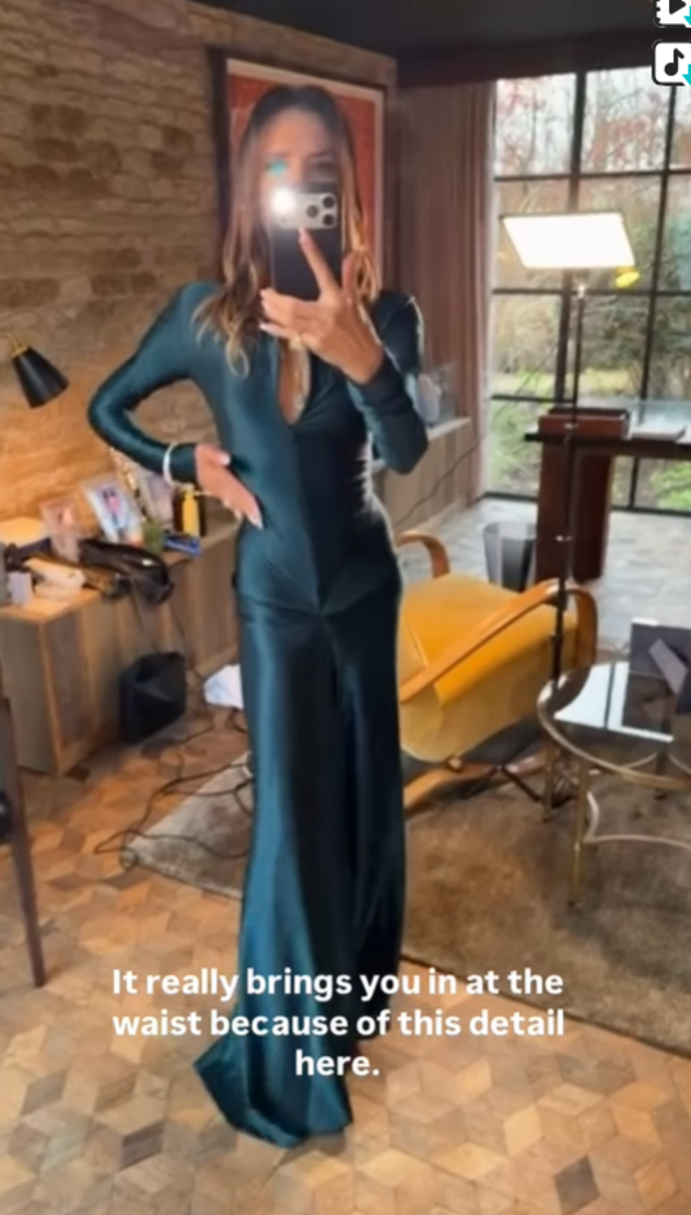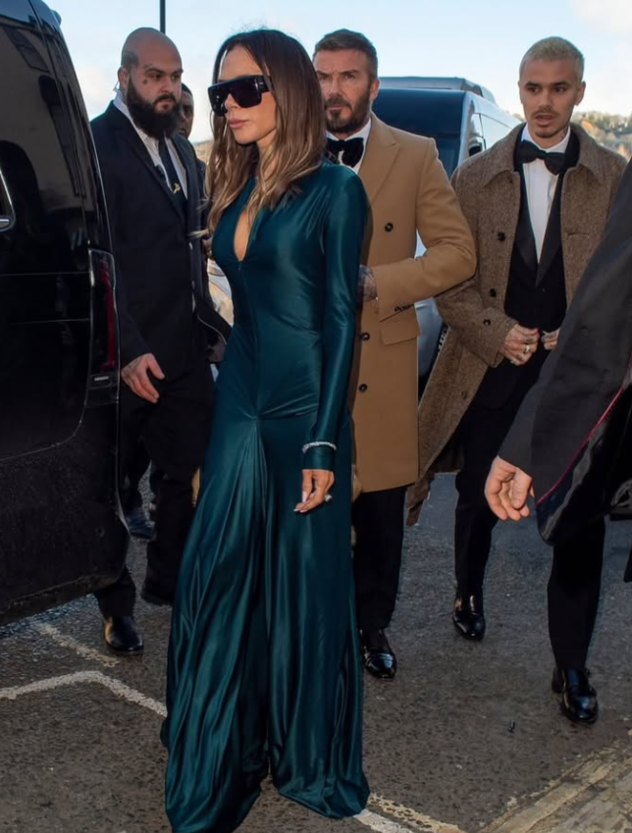 ויקטוריה לבשה שמלת סאטן ירוקה מהליין שלה, כמובן, עם שרוולים ארוכים, מחשוף קדמי עמוק ואלמנט כיווץ שמדגיש את קו המותן. השמלה זכתה לשבחים רבים, אך גם עוררה תגובות שעסקו ברזון של אשת העסקים והמעצבת. "איך את מעיזה עם הרזון הזה להגיד שהשמלה מחמיאה", הגיבו לה באינסטגרם, "מעניין אם אכלה משהו במהלך חג המולד?", הגיבה אחרת.
