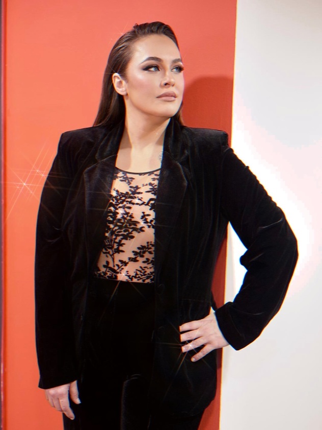אורית חכם, הסטייליסטית של פלס, בנתה סביב פריט הסטייטמנט הזה לוק שלם ומחמיא בעזרתה של חליפת קטיפה מחויטת. השילוב הזה יצר מראה רומנטי, מכשף וסקסי.