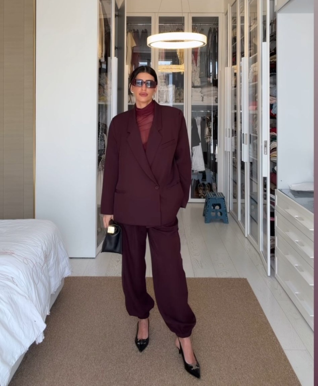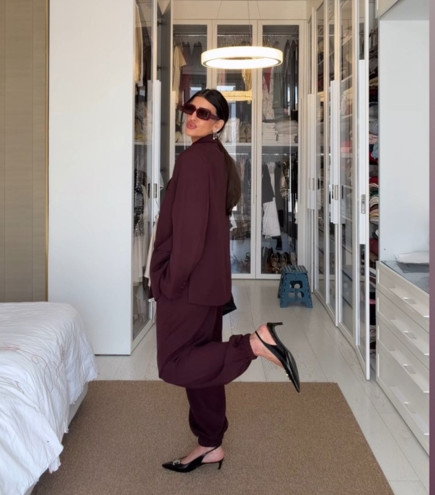 הבוקר אנחנו פוגשות אותה במערכת מחויטת שמבוססת על הגוון הטרנדי, חליפה מחויטת עם טוויסט, המורכבת מז'קט אוברסייז ומכנסיים בגזרת בלון עם אלמנט מכווץ בקצה. מתחת לז'קט היא לבשה טופ שקוף, בגוון תואם, שהעניק ללוק המונוכרומטי עוד עומק.