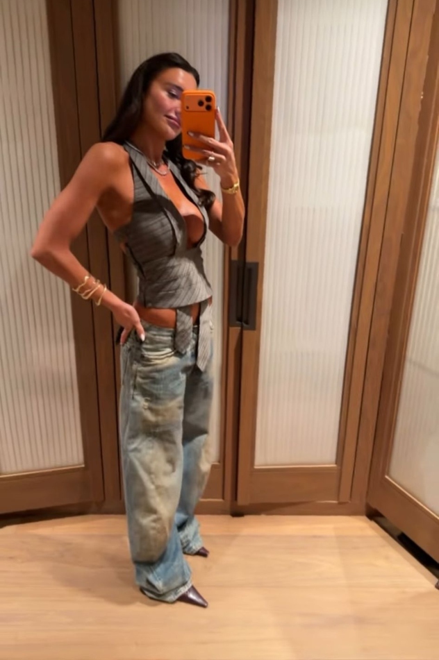בספלוב רכשה את הטופ הממותג בלונדון ובנתה סביבו לוק חורפי מחושב הכולל מכנסי ג’ינס בקו מותן נמוך של אקנה ונעלי שפיץ.