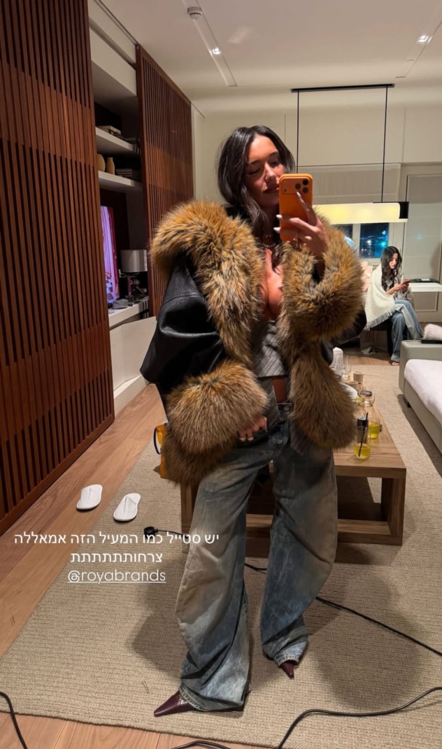 כדי לא לקפוא בחוץ, היא לבשה מעל האאוטפיט מעיל עור ענק עם עיטורי פרווה שנמצא בבוטיק ההשכרה רויה ברנדס. ככה לוקחים טרנד לוהט ומעלים אותו לנקסט לבל.