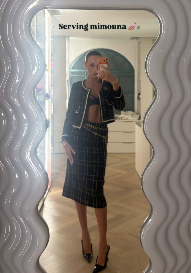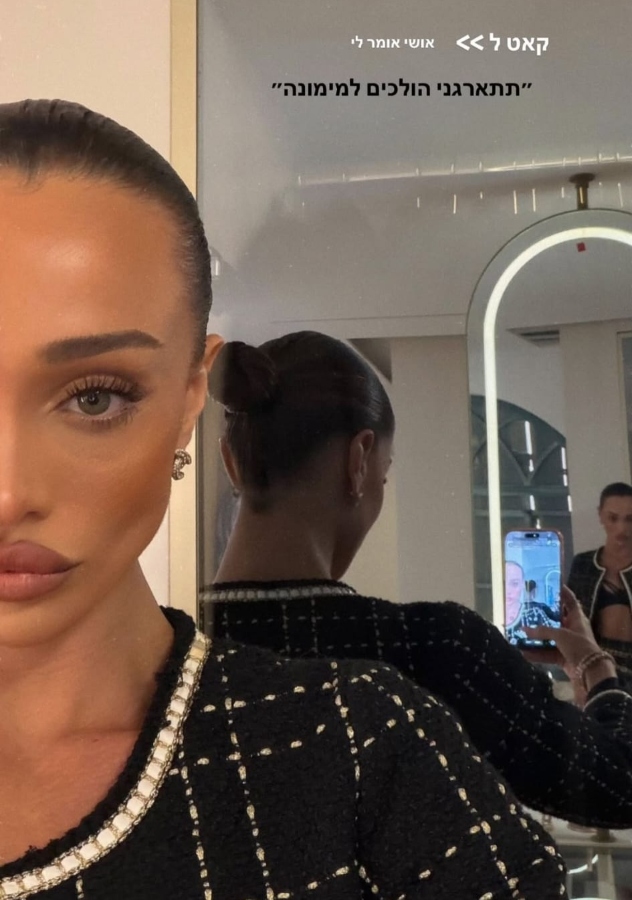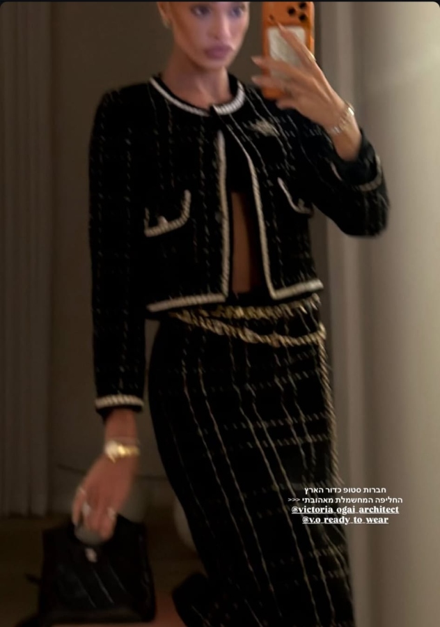 ואז, כפי שסיפרה בסטורי, "קאט ל: אושי אומר לי, 'תתארגני, הולכים למימונה'". והיא אכן התארגנה, על לוק מעולמות השאנל הסקסיים: חליפת חצאית במראה הטוויד המוכר, שכוללת חצאית צמודה לגוף באורך שחוצה את קו הברכיים וז'קט בוקסי קטן של המעצבת והארכיטקטית ויקטוריה אוגאי, המתמחה דווקא בהלבשה צנועה.