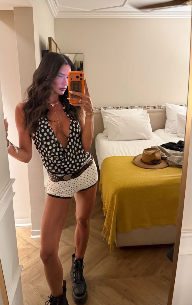 גם אדל בספלוב בחרה באקססורי הטרנדי, שאצלה השלים לוק הכולל מכנסיים וטופ עם מחשוף נופל ועמוק, שניהם בפרינט נקודות לא תואם, ונעלי ד"ר מרטינס על פלטפורמות גבוהות.